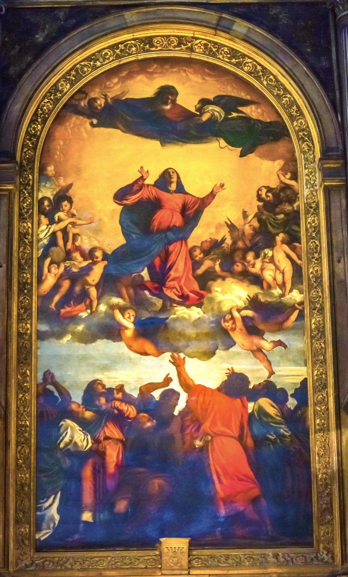 Tiziano utilizó el bermellón para resaltar sus obras, utilizando el pigmento más caro y de más alta calidad en la Asunción de la Virgen, en 1516. El color refleja la principal característica que dominó la pintura de Tiziano. Enciende esta obra con un rojo intenso vistiendo a tres figuras: la Virgen en el centro de la composición y dos apóstoles en la parte inferior. A pesar del rojo dominante, la unión de los colores suaviza el resultado final. María viste los colores de la iconografía clásica, el rojo de su túnica indica su completa humanidad y es símbolo del amor.
