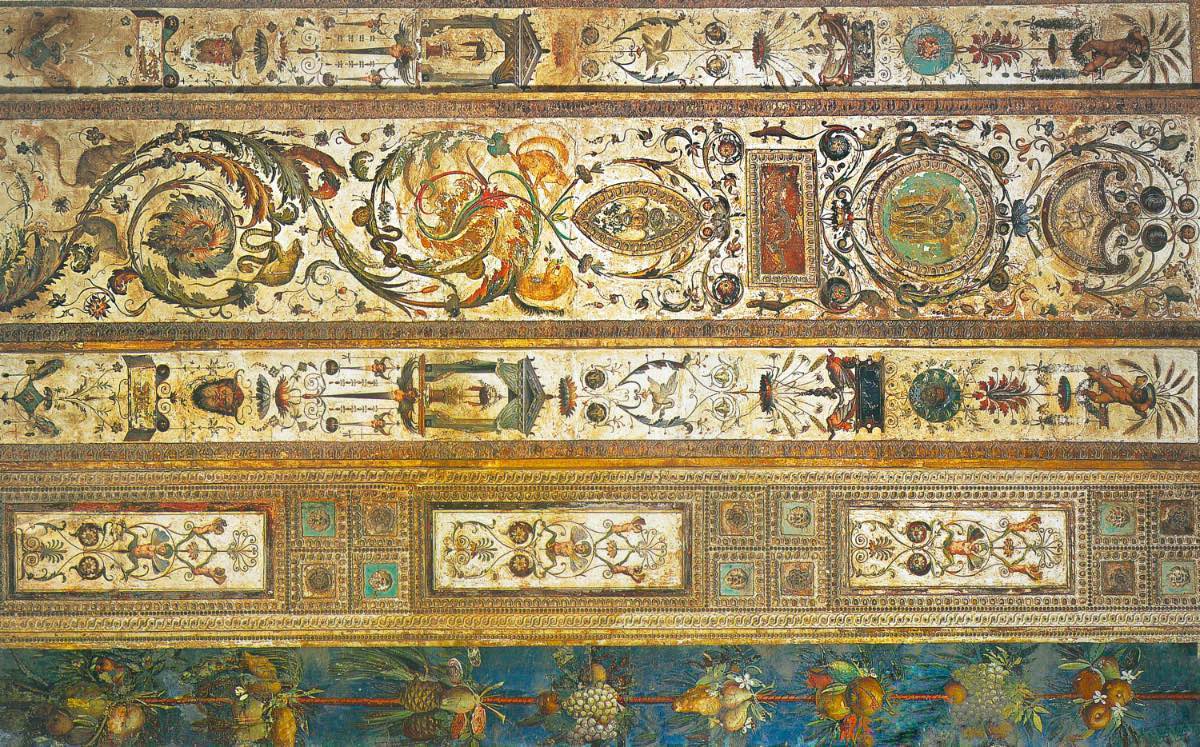 La expansión de esta decoración grutesca se vio favorecida por los dibujos que tomaron los artistas, que visitaron las grutas de lo que era en el siglo XV la Domus Aurea.